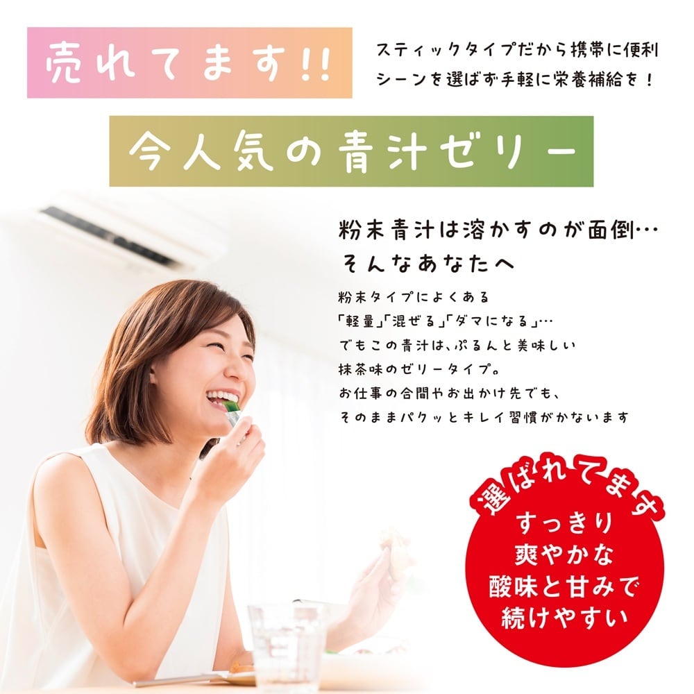 特徴 国産の大麦若葉、植物性乳酸菌、234種の植物発酵エキスを配合したゼリーを宇治抹茶を用いて食べやすい抹茶味に仕上げました。 食べやすく、のどごしすっきり。ほどよい酸味と甘みで飽きのこない味です。 健康習慣 「手軽にチャージ 潤い青汁」